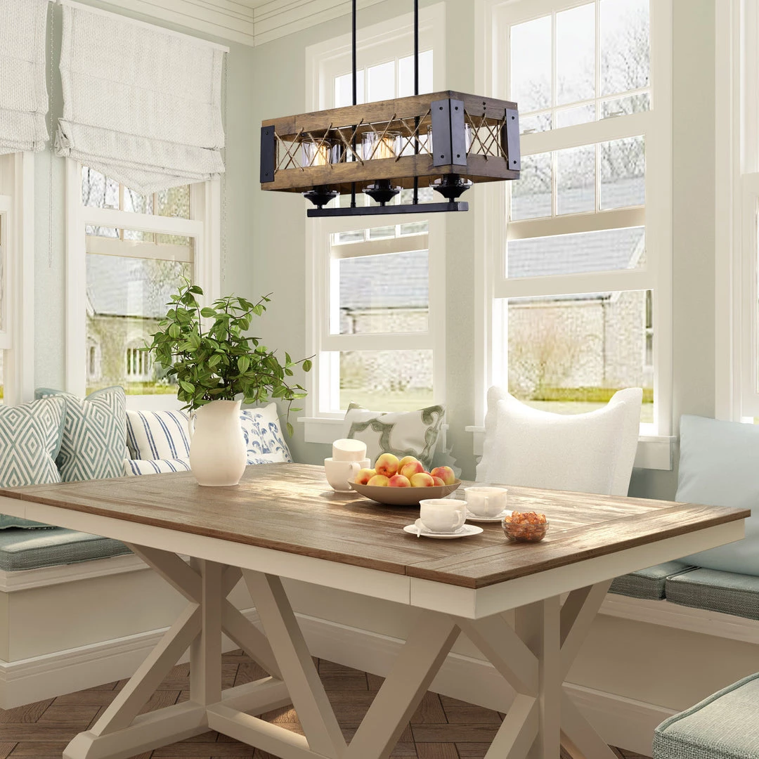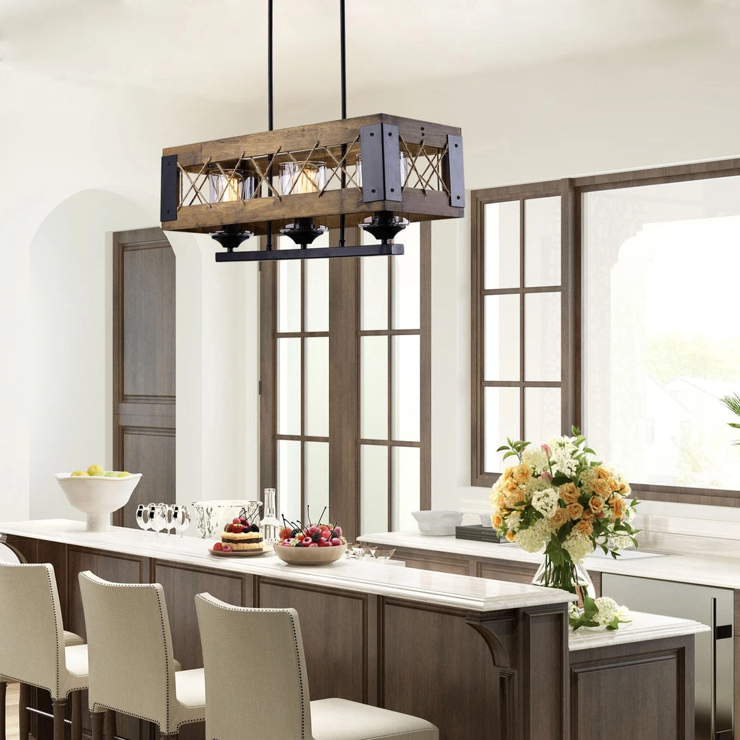 Medium in size and crafted in a farmhouse style, yet urban industrial design makes it the best. The iron base and natural wooden frame along with hemp-ropes offer an industrial farmhouse look highlighted by clear glass cylindrical shades for a touch of dazzle and dimension making it perfect for entryway, dining room, living room, foyer, or restaurants.The farmhouse chandelier package includes all the necessary assembling and installation parts along with clearly marked cords. Having previous experience and some electrical knowledge should be enough to qualify you for doing the installation by yourself instead of hiring an electrician and spending more money.