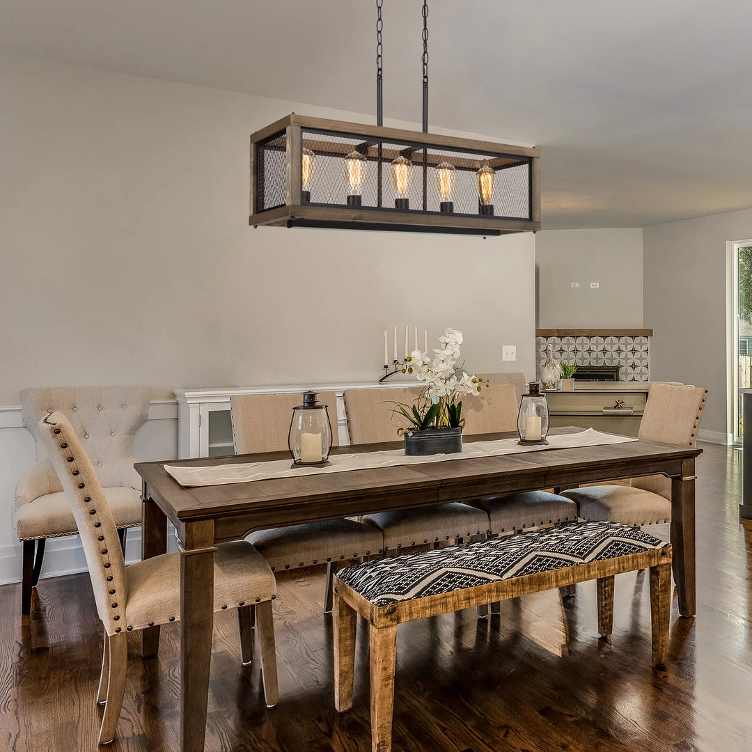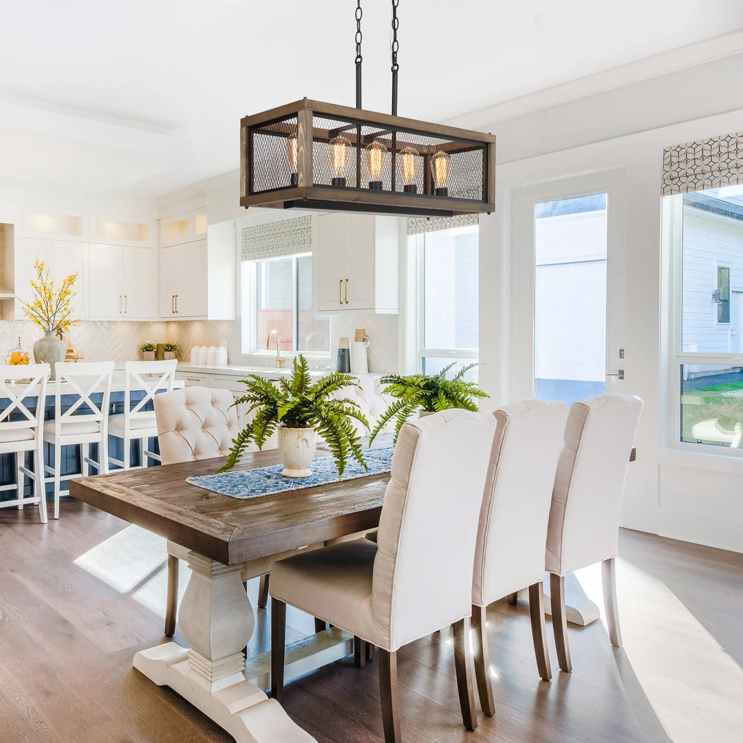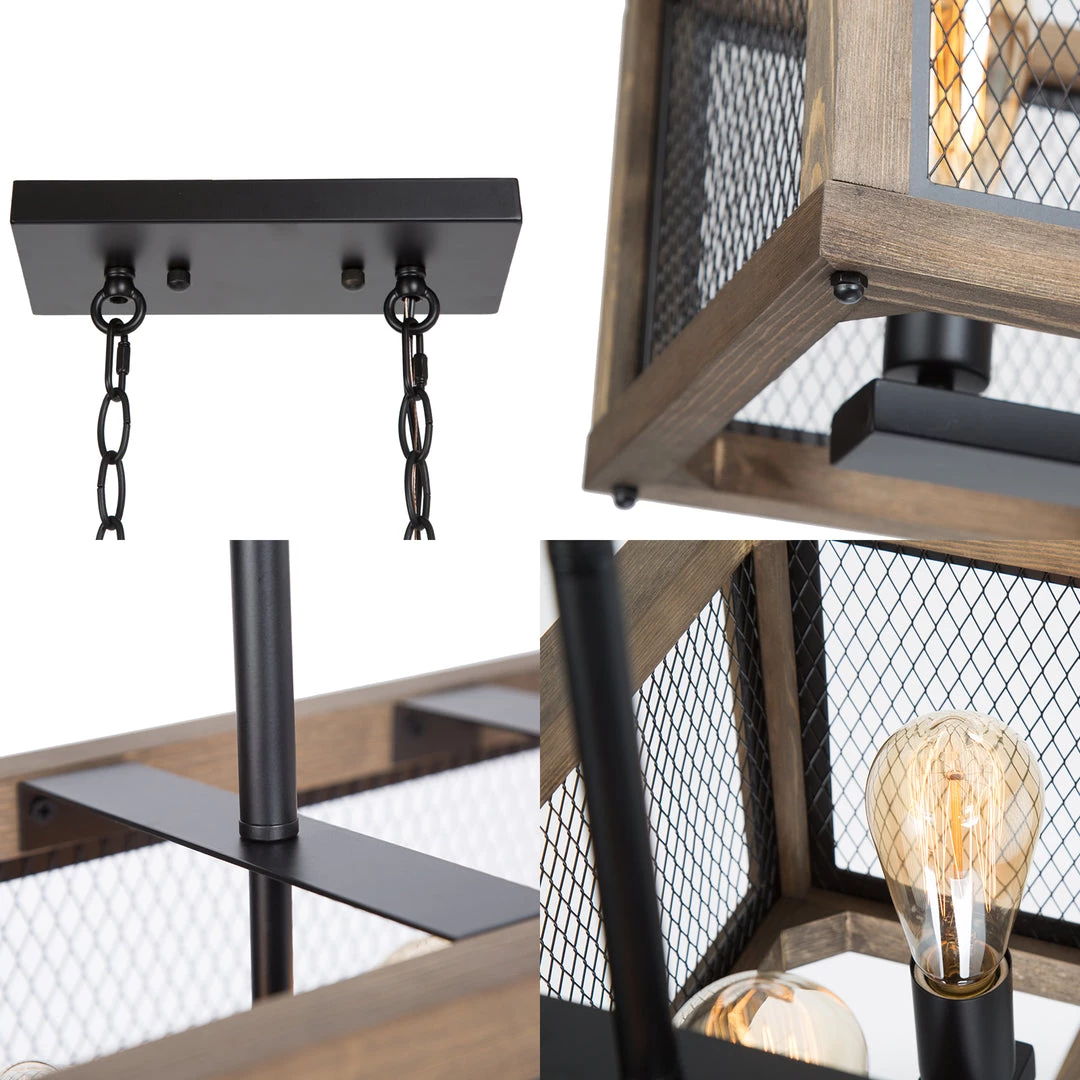 Make a dramatic statement with this unique industrial farmhouse kitchen island chandelier. The hand-crafted veneer is finished in rustic grey for the apparent rustic and unpretentious qualities. The mesh net underscores the industrial and masculine vibes of the piece while keeping the fixture understated but with unique personalities.