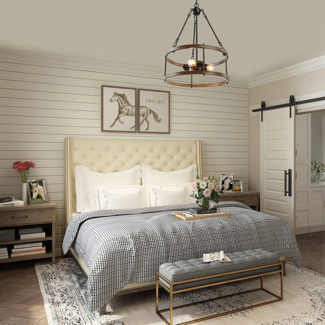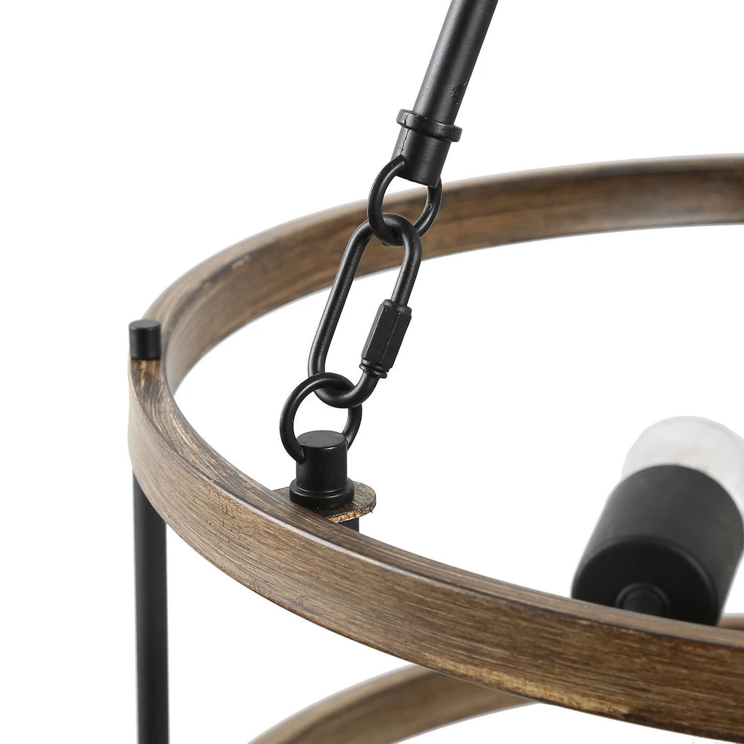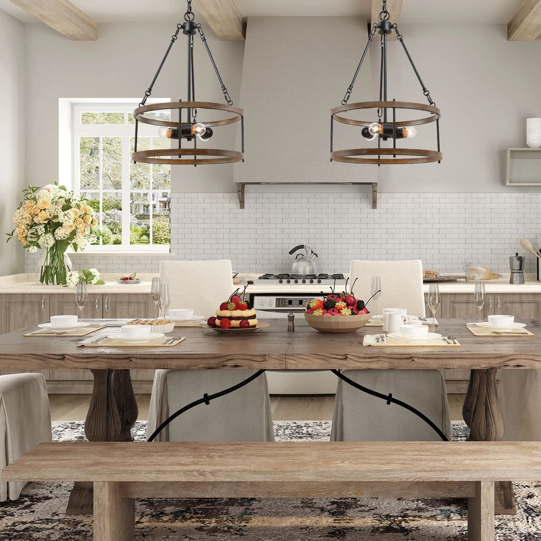 The perfect pick for any farmhouse or cabin-inspired aesthetic, this small chandelier features a rounded metal frame with circular Faux-Wood accents awash in a brown finish. Beyond brightening your abode, dining room chandelier make a statement in any interior design without occupying valuable floor space.