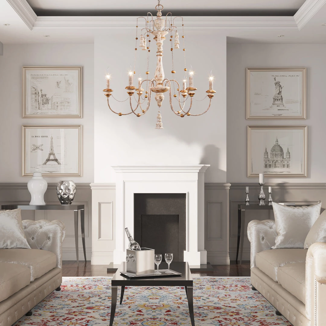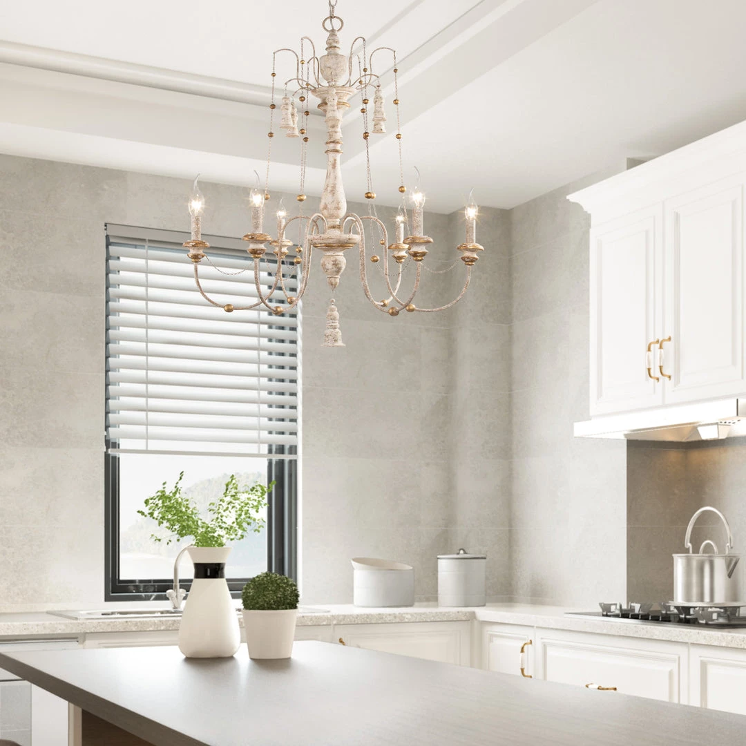 Wooden details are finished in a gray wash that has just the right hint of rustic sense. With an old-fashion trend in mind, this fixture will create a calming vibe for a foyer or dining room space.