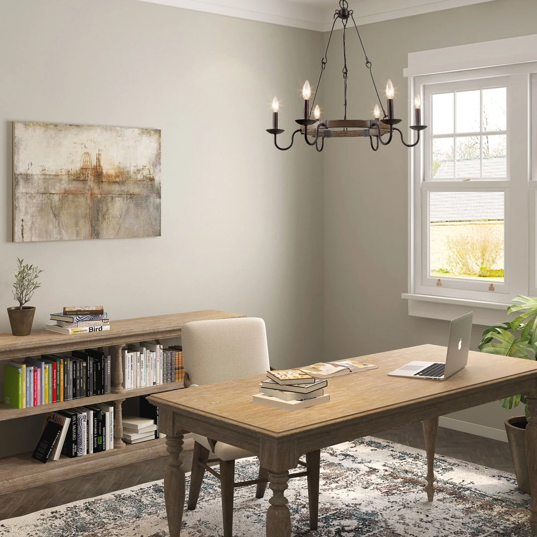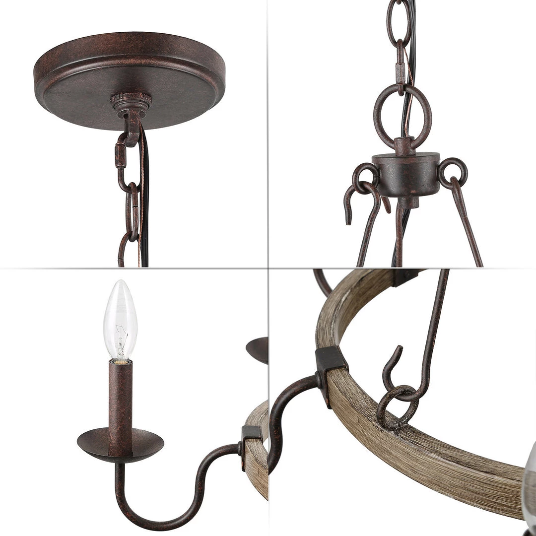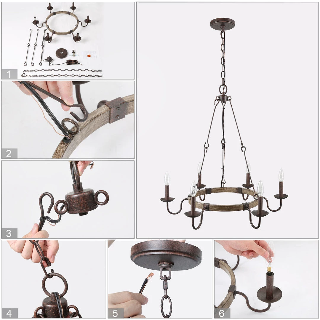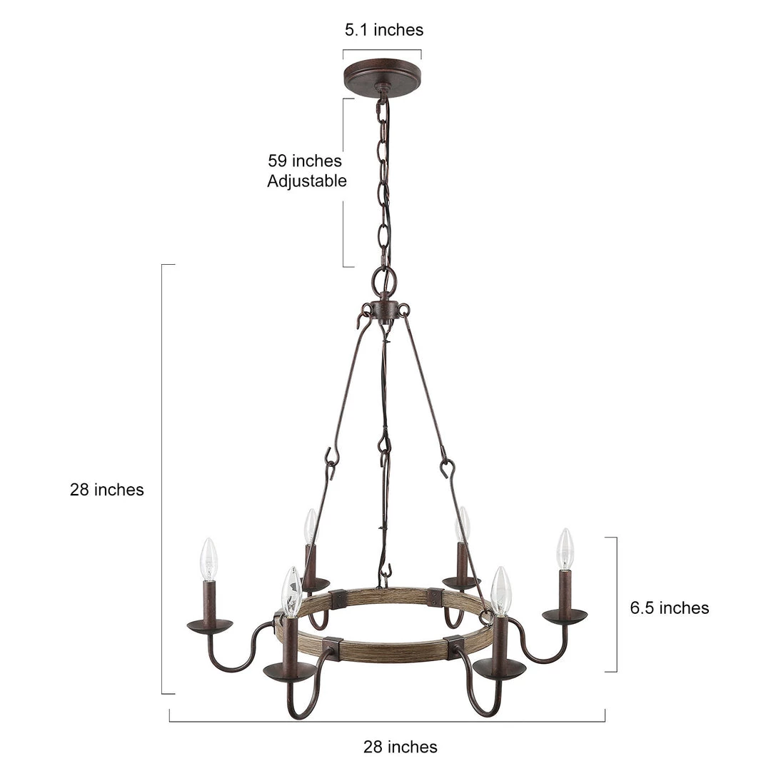 Rustic wagon wheel chandelier, especially designed to illuminate the heart of your living room, foyer, dining room or farmhouse styled places. Crafted of metal in a faux wooden finish, this design features 6 candle-shaped bulb stems with dish cups, placed on 6 simply curved iron arms.