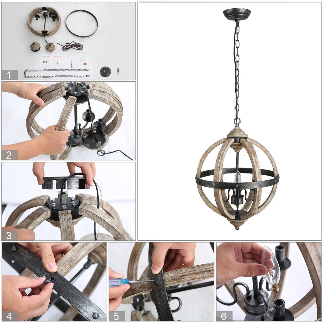 Crafted of quality antique gray finished rustic wood frame, this rustic chandelier features an elegant sphere wrapped with a hand-polished silver painting metal strap, the combination of silver metal and solid wood makes this dining room chandelier a vigorous trendy piece.