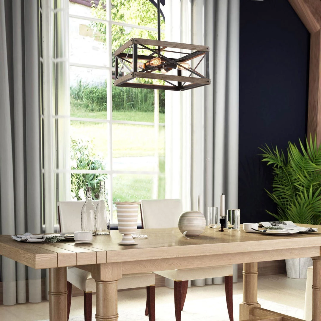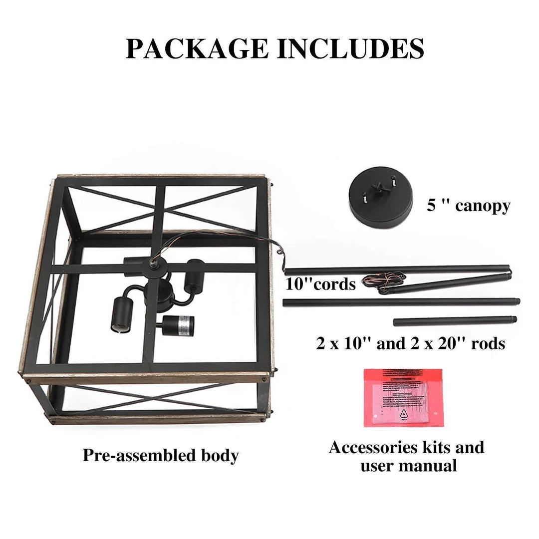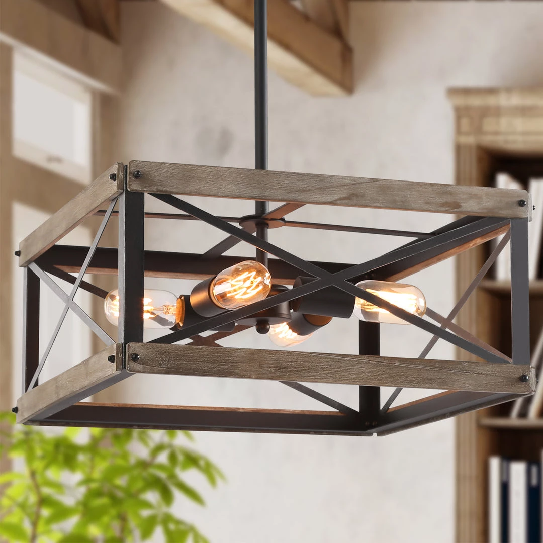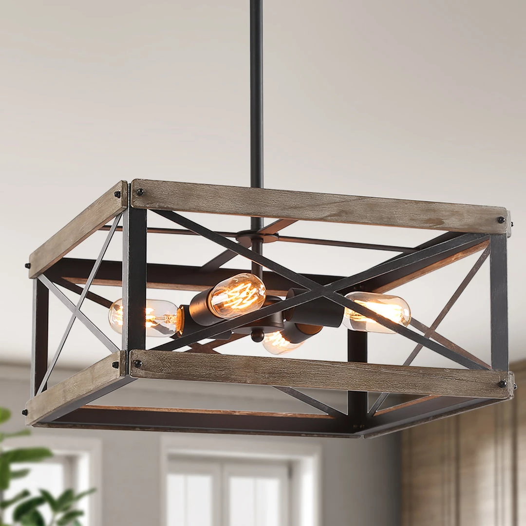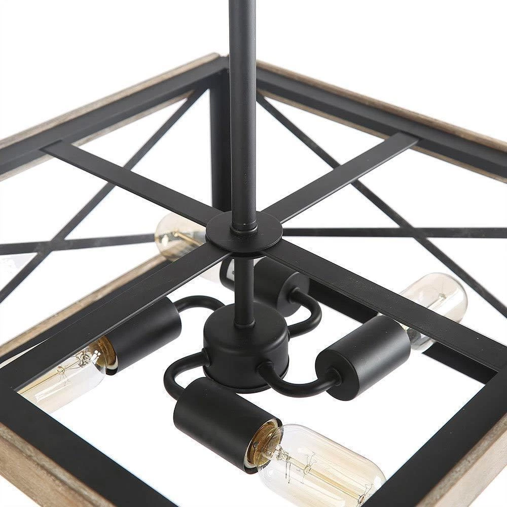 The striking geometric light features a black-painted wood enclosure to frame vintage-style light bulbs (not included). It is constructed with durable iron and natural wood, which creates a classic and rustic interest.
