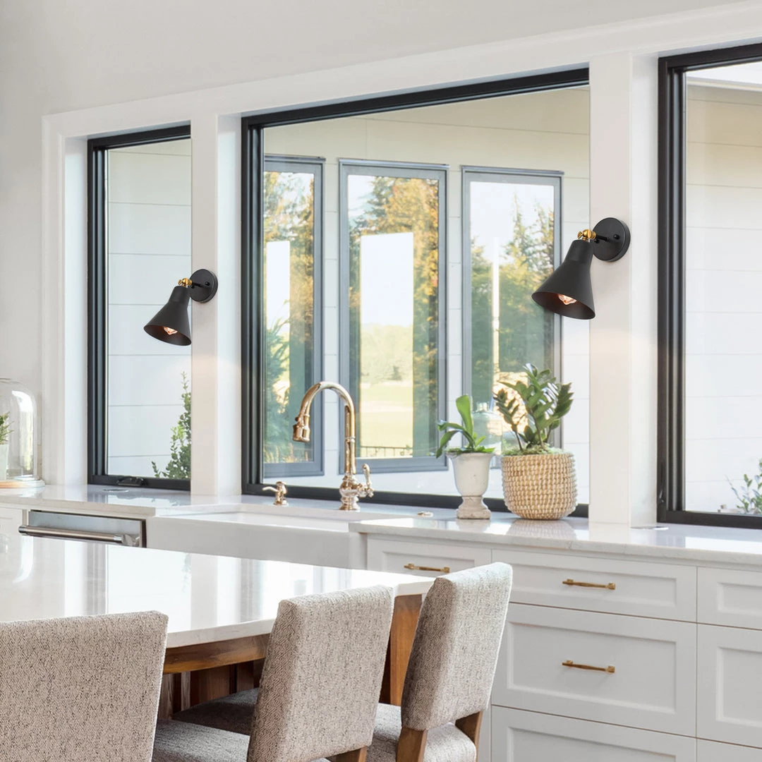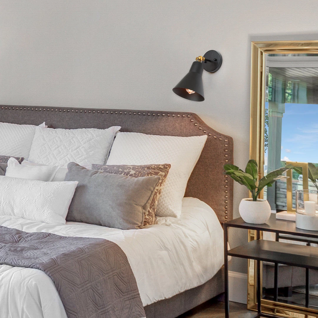 This industrial-inspired single swing joint sconce is an attractive and chic task light. It features a sleek black finish with a cone-shaped shade. You can easily shift the direction of the illumination. This 1 light wall light can serve as a reliable helper as well as a good companion next to your sofa or wherever you need much brightness.