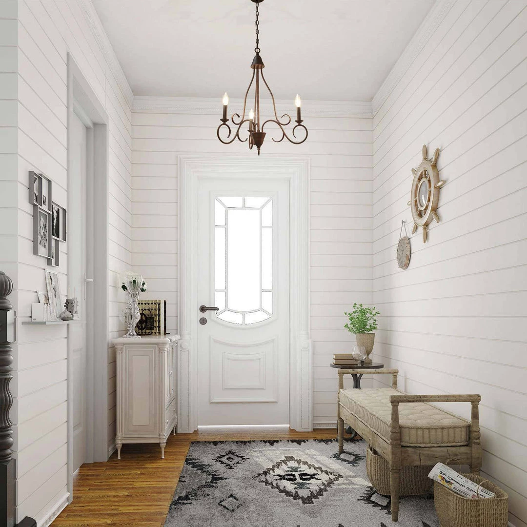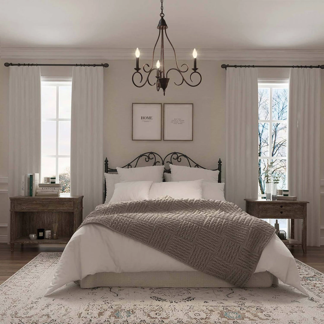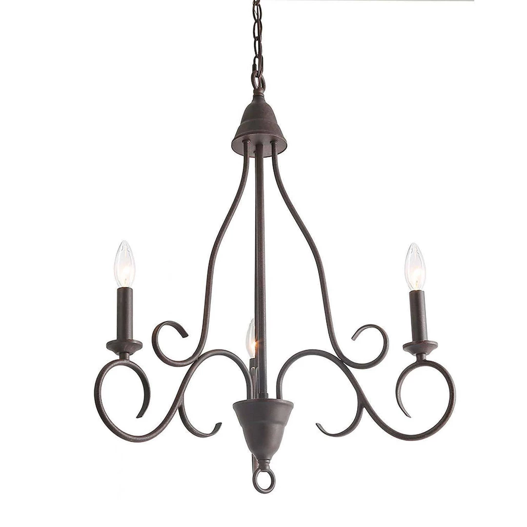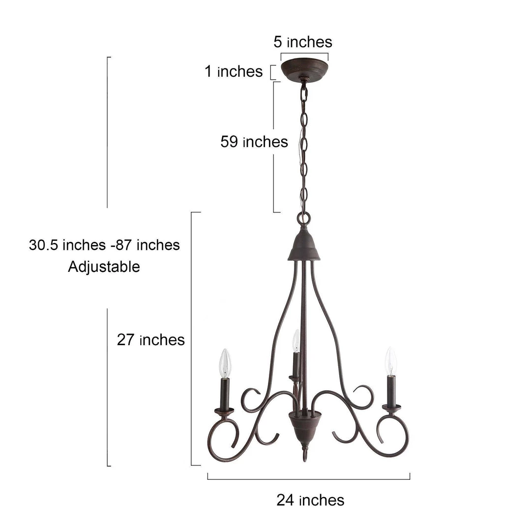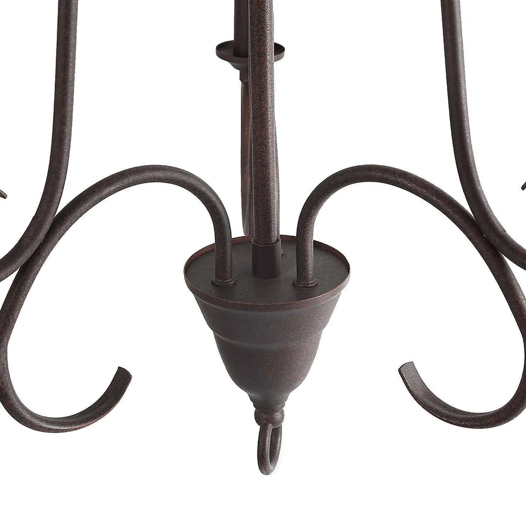 Being crafted in a rusty metal finish, this design features 3 candle-shaped bulb stems with dish cups, placed on 3 curved iron arms. The three curved arms topped by three illuminating candlesticks suits both modern and traditional home styles. This chandelier was specially designed to brighten up the heart of your cozy rooms whether it was a kitchen, dining room, entryway, or bedroom, it fits most transitional-styled places.