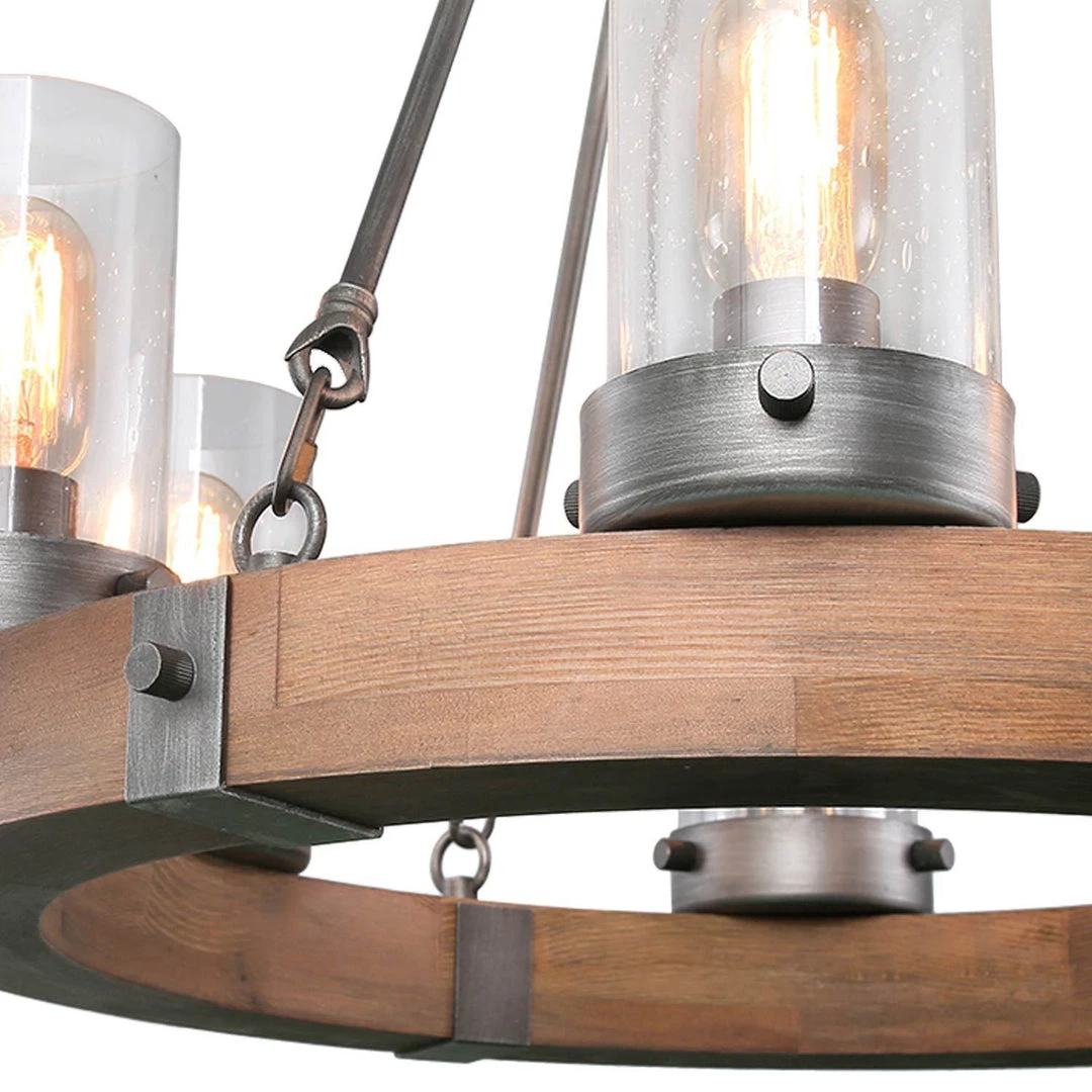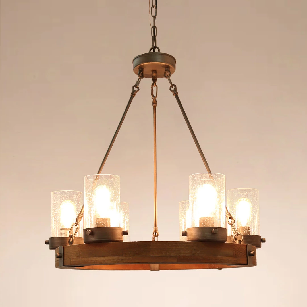 The 6-Light wood chandelier will lend a transitional charm to your decor. The chandelier makes a statement in any interior design without stealing valuable floor space. This beautiful six-light transitional chandelier has a wood ring frame, which creates the warm, inviting feel of this open and airy. Transitional Chandelier: it has a wood circular base with cylinder glass shades offering a refined appeal.