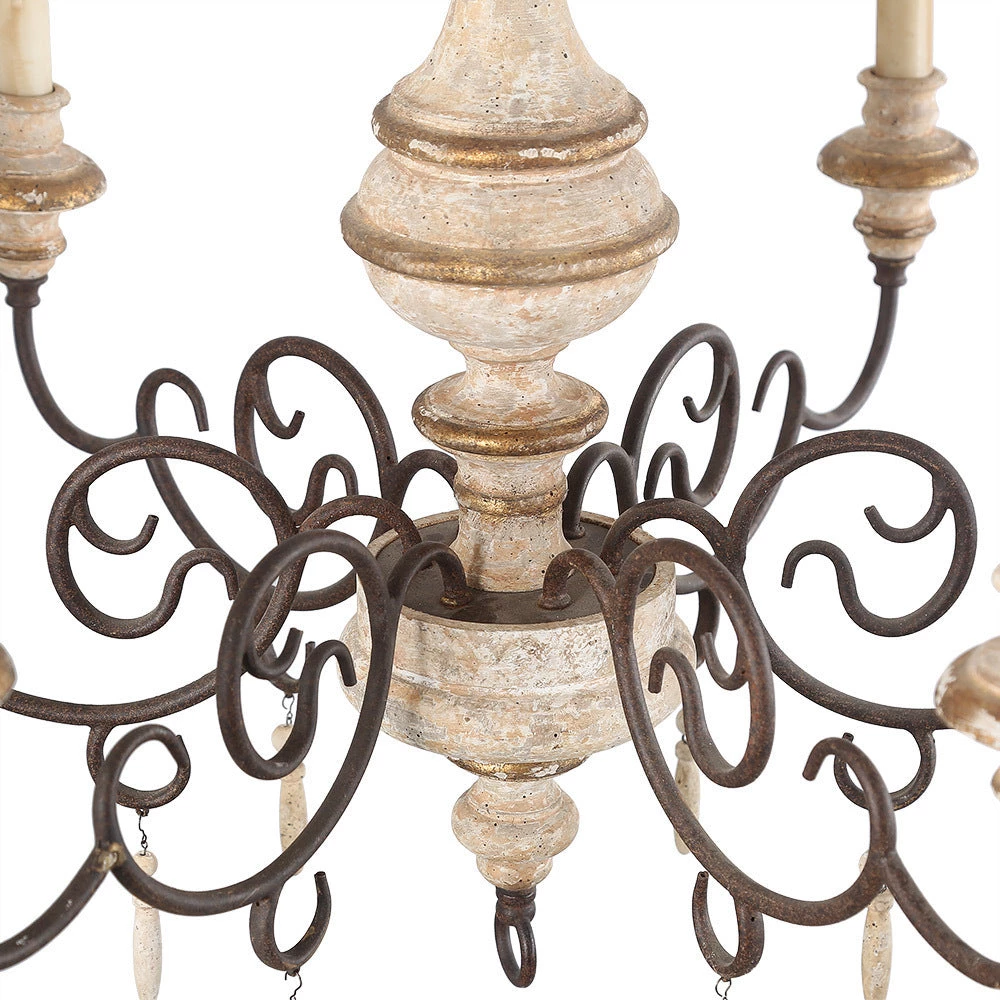 Defined by its classic candle-style silhouette, this six-light french country chandelier brings elegant appeal to your home.Six curving rusty iron arms radiating from a spindle-shaped wood body in an antique white finish, and traditional candle covers create a vintage-look chandelier.