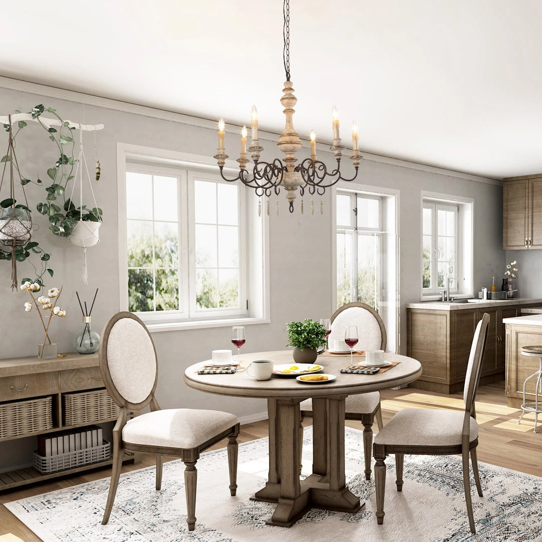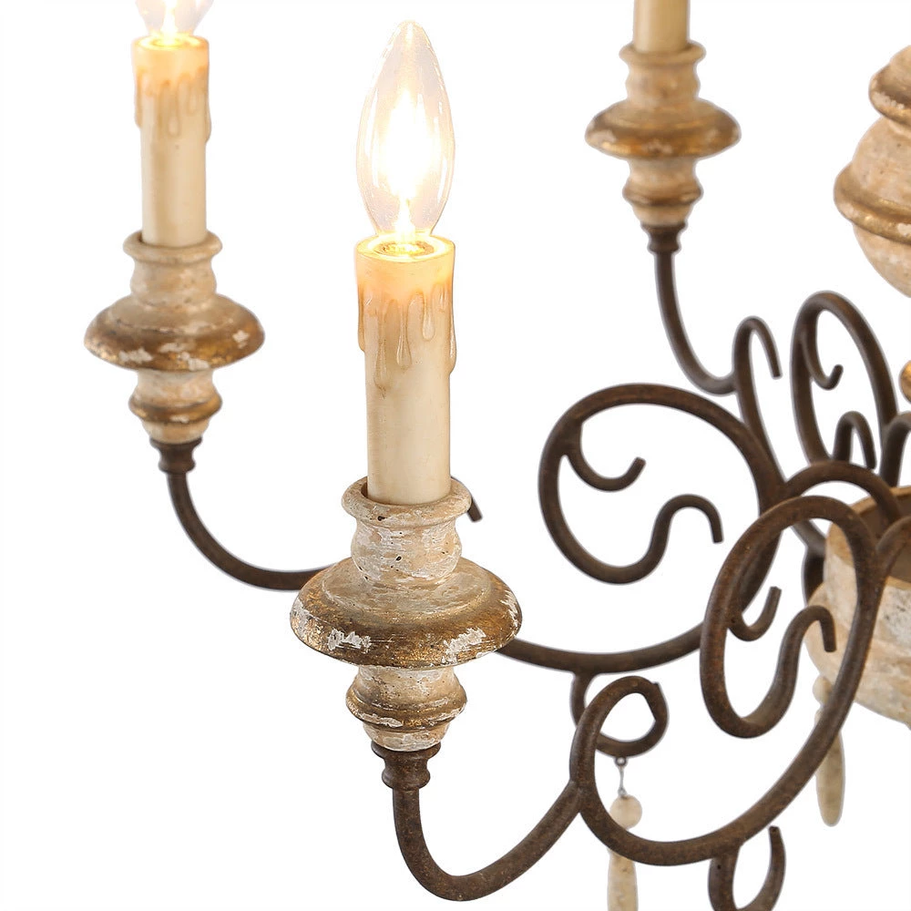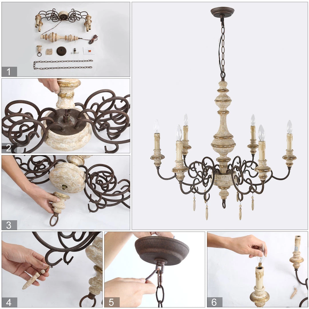 Defined by its classic candle-style silhouette, this six-light french country chandelier brings elegant appeal to your home.Six curving rusty iron arms radiating from a spindle-shaped wood body in an antique white finish, and traditional candle covers create a vintage-look chandelier.