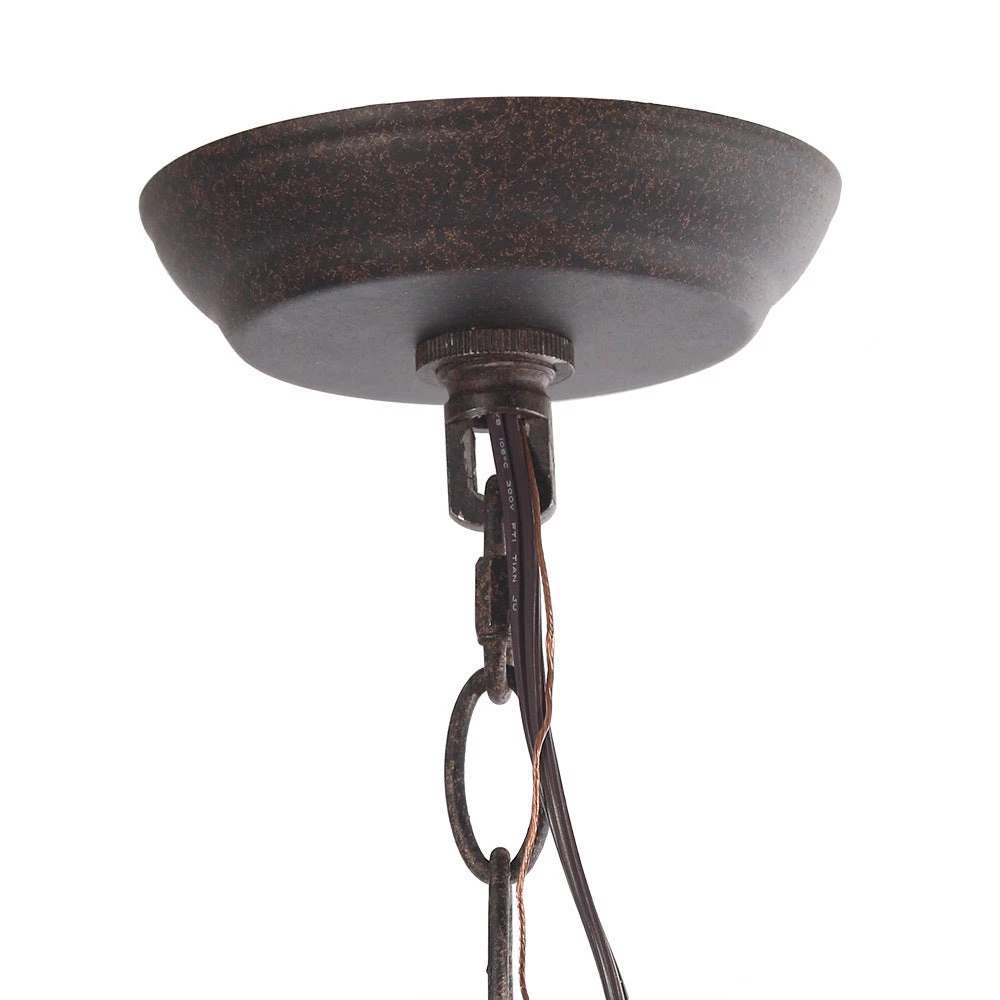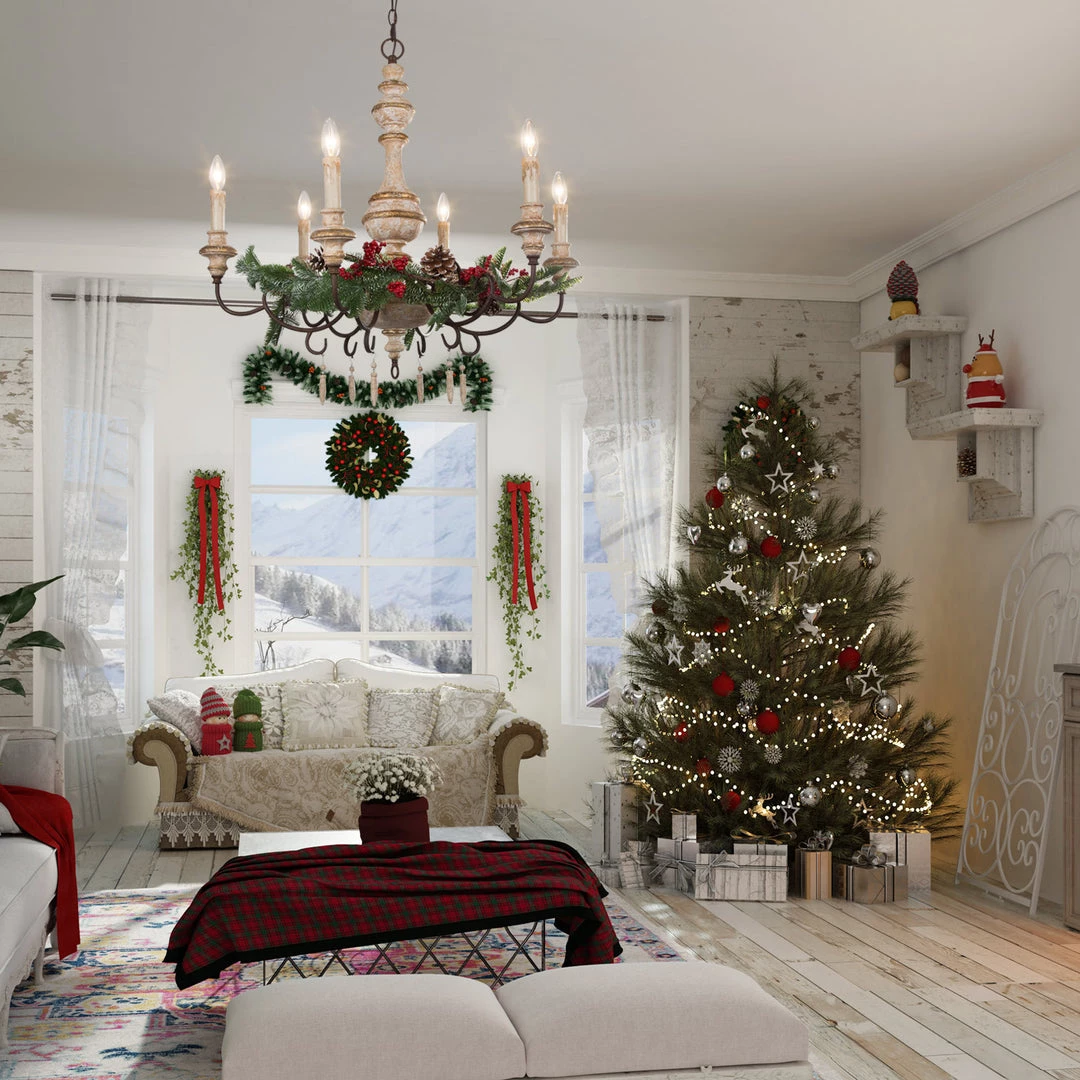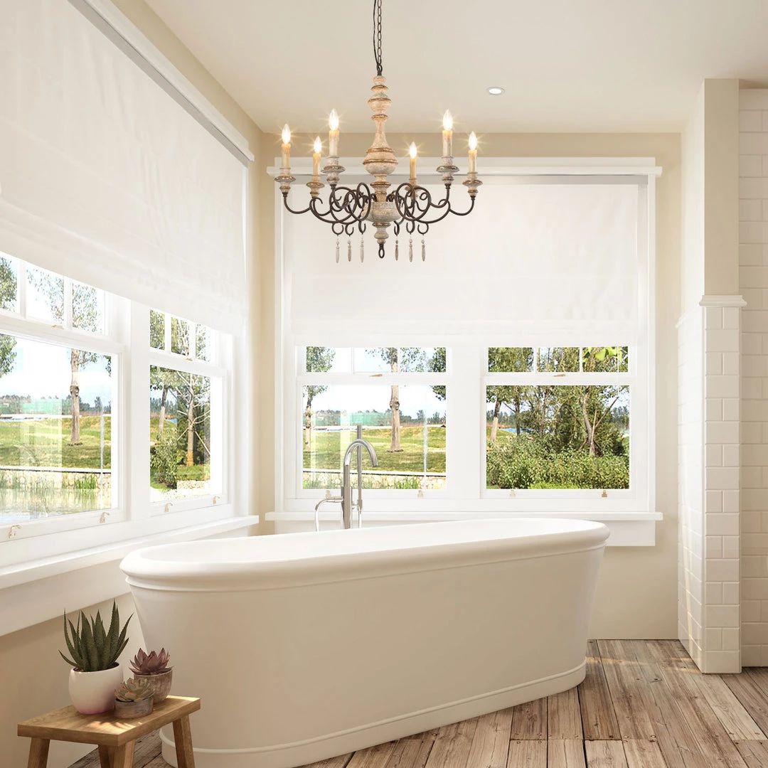 Defined by its classic candle-style silhouette, this six-light french country chandelier brings elegant appeal to your home.Six curving rusty iron arms radiating from a spindle-shaped wood body in an antique white finish, and traditional candle covers create a vintage-look chandelier.