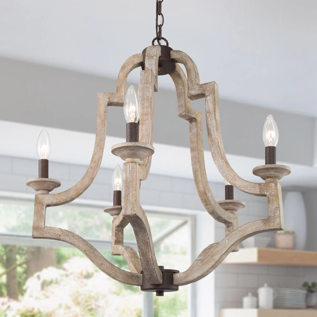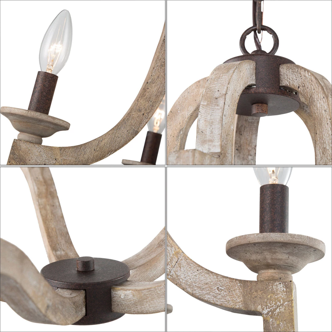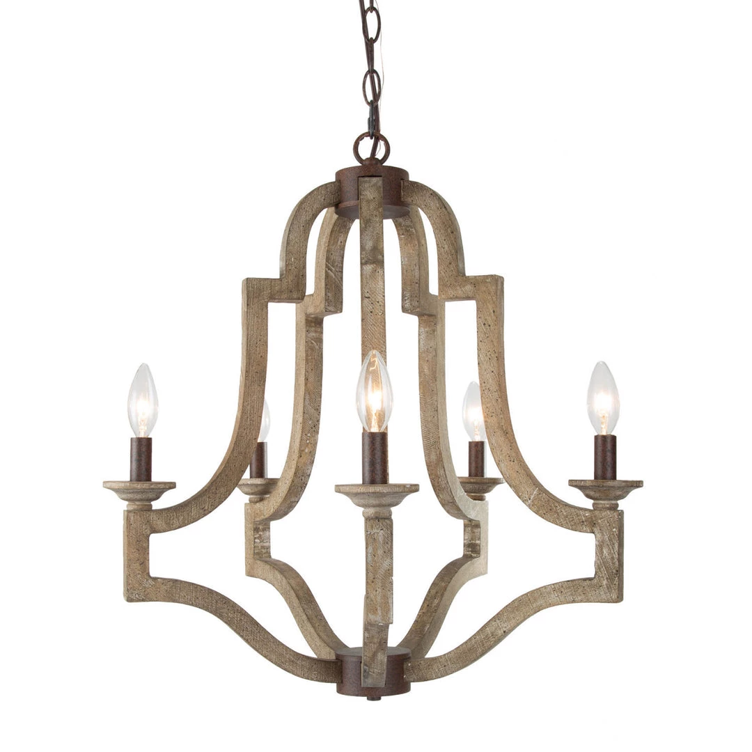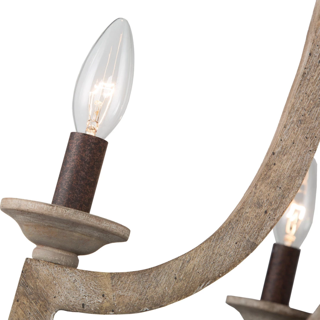 Inspired by wooden slats of the vineyard, this bent-wood wine barrel chandelier is strapped with a gray wash metal ring and 5 candelabra arms in mottled simplicity. Naturally aged poplar wood is sand finished to coordinate with any decor from casual coastal or French country to urban farmhouse.