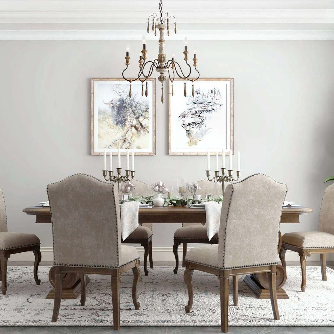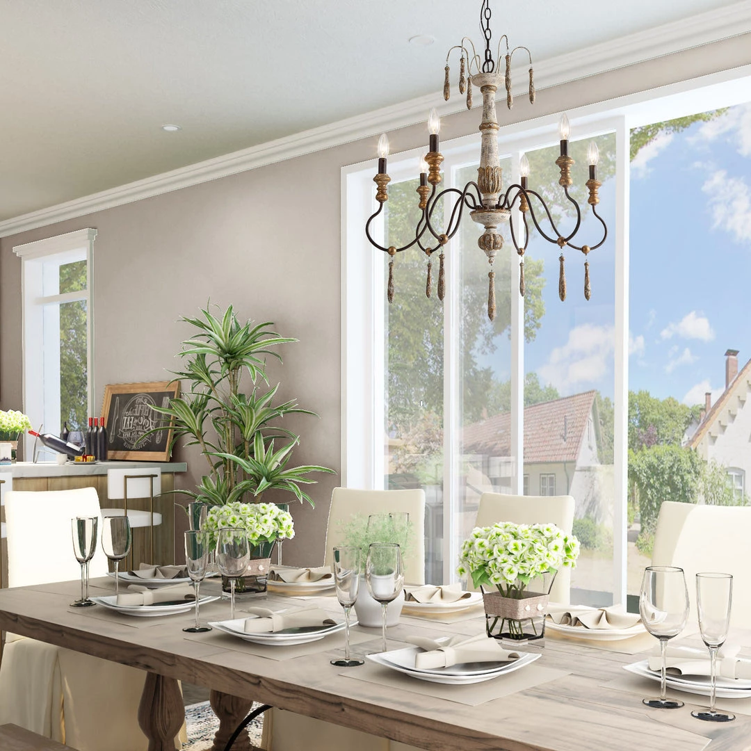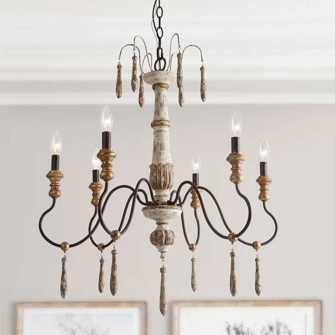 Brimming with rustic countryside flair, the wooden french country chandelier in Persian white is crafted of steel and contained detailed designs featuring soft curves and leaf-like motifs. This chandelier’s center column of hand-carved wood is accented with scrolling arms in a rich rust finish. Hanging accents up above and down below complete the design with a decorative touch. Supported by an adjustable chain, this luminary is compatible with a vaulted ceiling. The country cottage style is sure to complement any bedroom, living room, kitchen, dining room, entry, or hallway. This candle chandelier offers a chic french country silhouette in a rust finish. White distressed finish accented with a rust patina.
