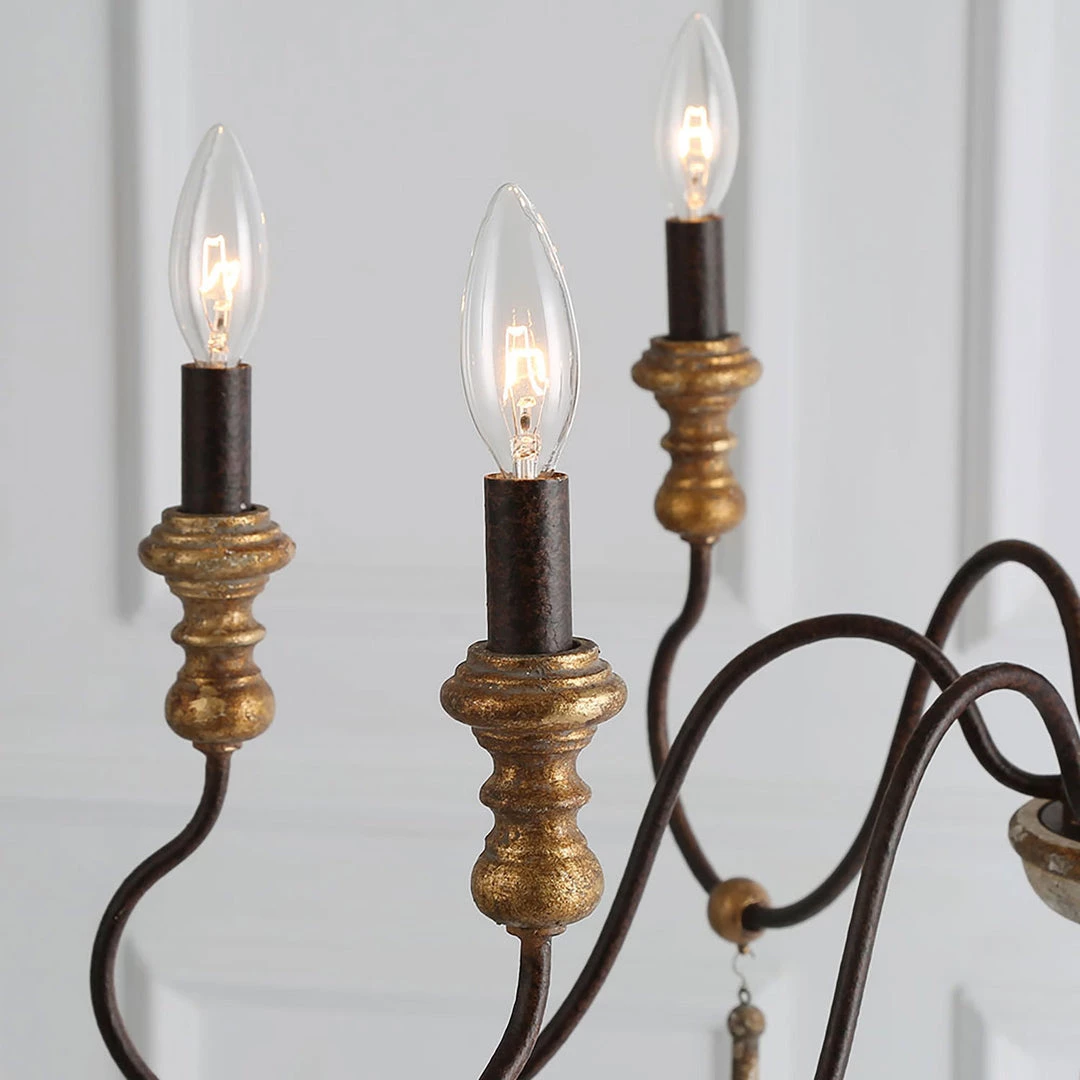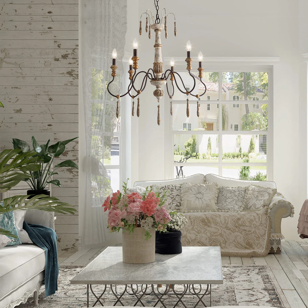 Brimming with rustic countryside flair, the 2-tier french country chandelier in Persian white is crafted of steel and contained detailed designs featuring soft curves and leaf-like motifs. This chandelier’s center column of hand-carved wood is accented with scrolling arms in a rich rust finish. Hanging accents up above and down below complete the design with a decorative touch. Supported by an adjustable chain, this luminary is compatible with a vaulted ceiling. The country cottage style is sure to complement any bedroom, living room, kitchen, dining room, entry, or hallway. This candle chandelier offers a chic french country silhouette in a rust finish. White distressed finish accented with a rust patina.