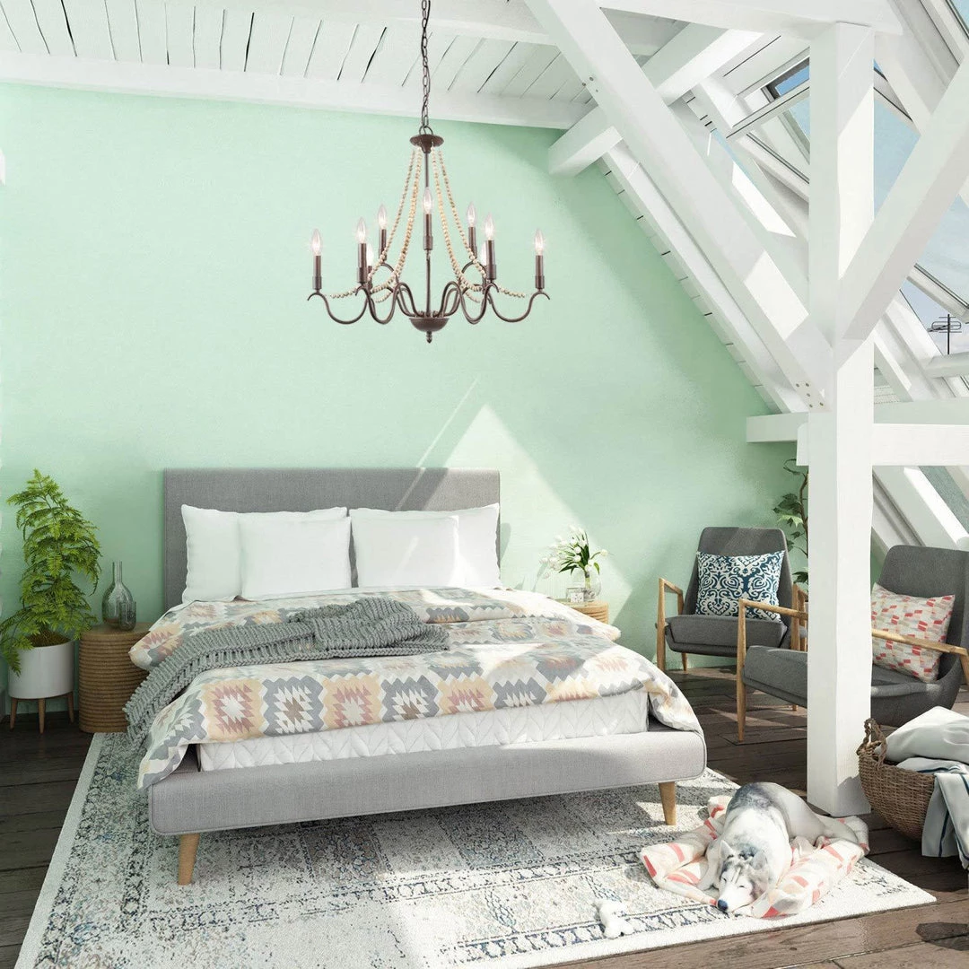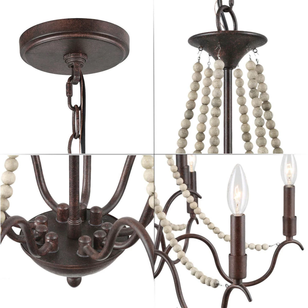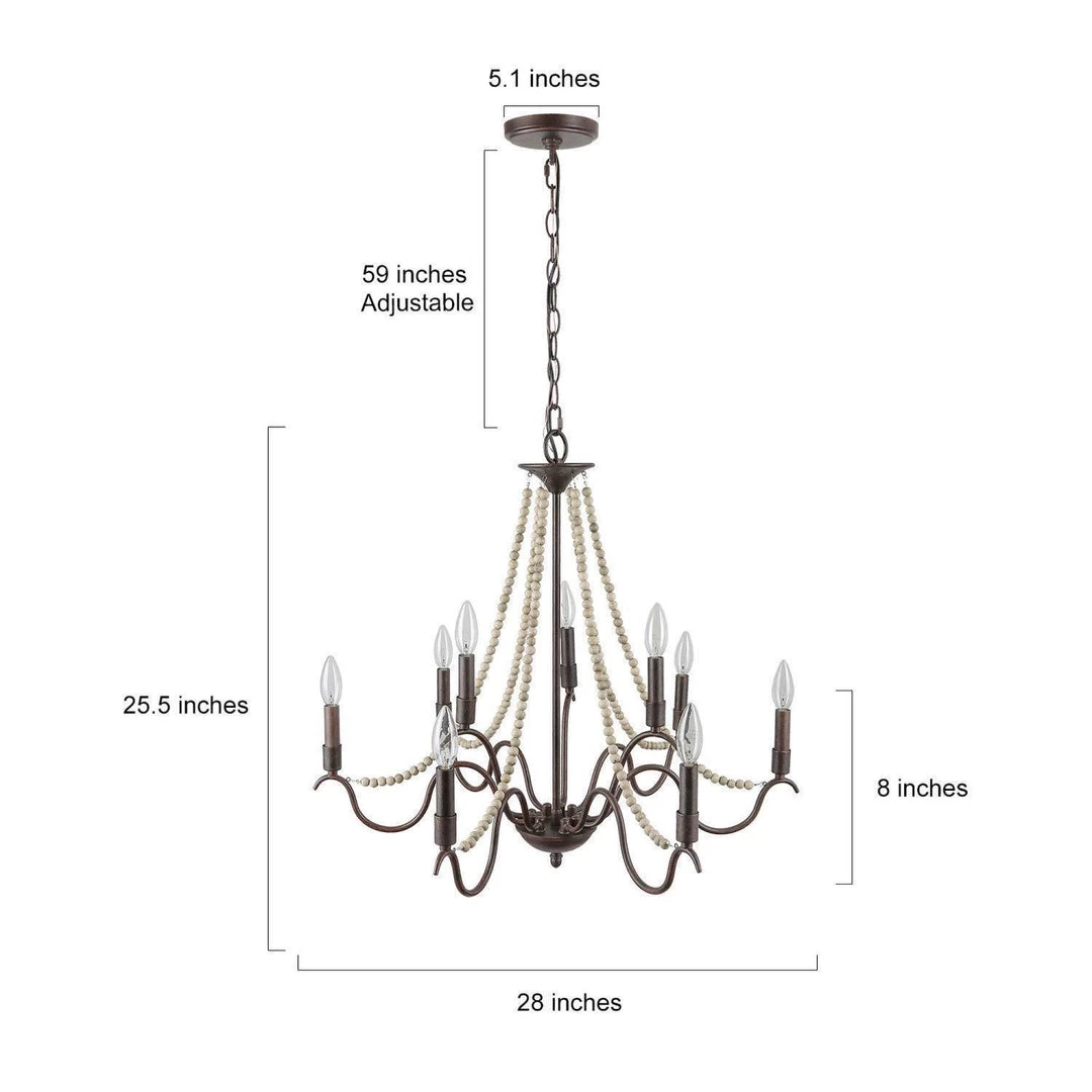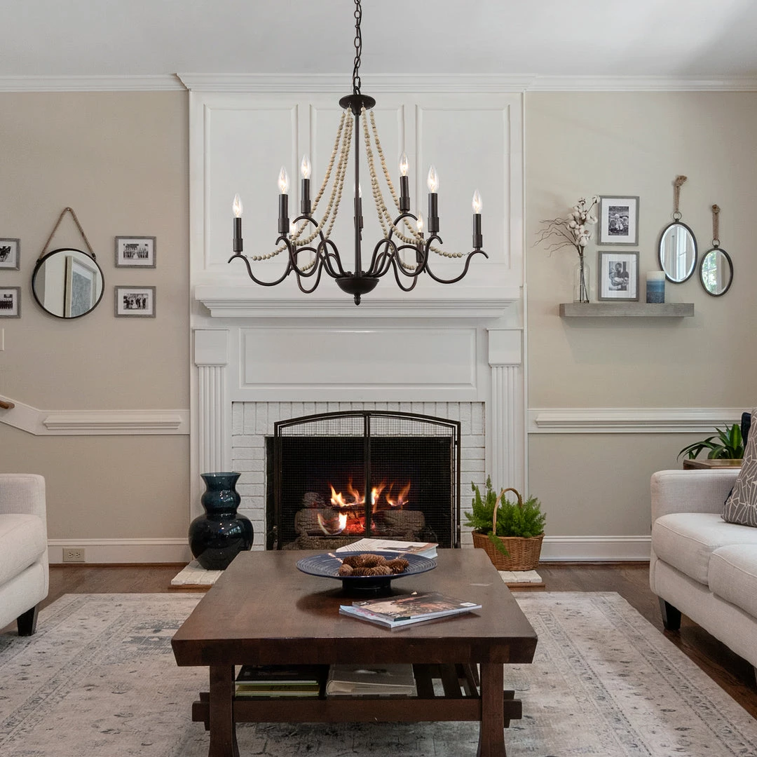 The iron sleek arms made from rustic iron break the clinch of traditional French country style, adding more modern vibes into your stylish room. The wood beaded lines portray the beautiful curves of this gorgeous chandelier. This stunning fixture stands out by the feeling of Versailles luxury. It’s the best centerpiece choice of a bedroom, living room, dining room, or even foyer.