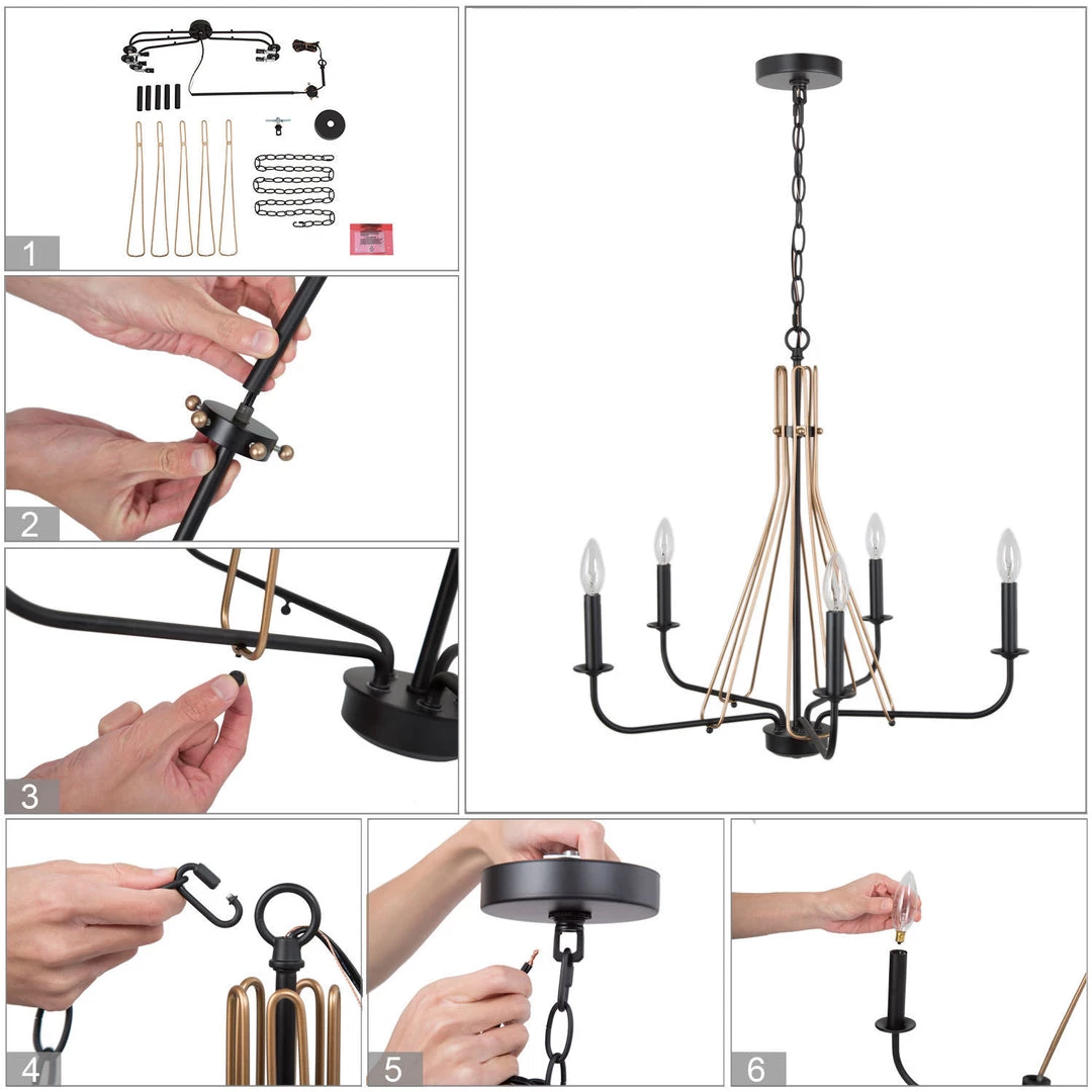 Chic Industrial Black Chandelier, typically designed to shine charmingly in your bedroom, living room, or anywhere you would love to add a touch of modern charm. Crafted of metal in classic black and champagne metal finish, this gorgeous piece features 5 candle-shaped bulb stems, placed on 5 simply curved iron arms.