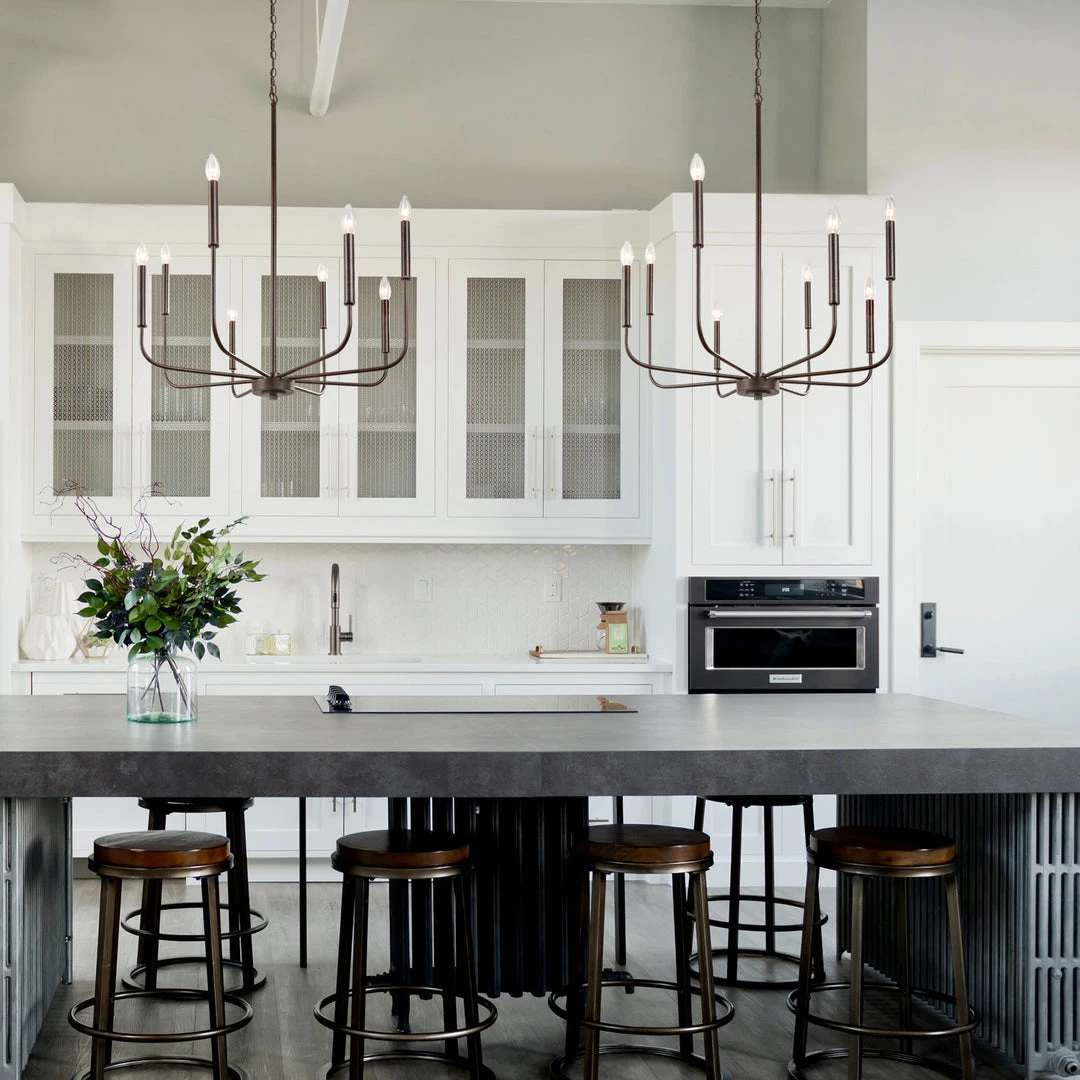 This modern 8-light chandelier stands for simplicity and minimalism. Crafted of sturdy metal in a dark bronze finish, this piece could perfectly complement modern, transitional, or industrial styles. It offers striking fluidity and a seamless modern feel. Add some glam into your living room, bedroom or kitchen with this statement chandelier now!
