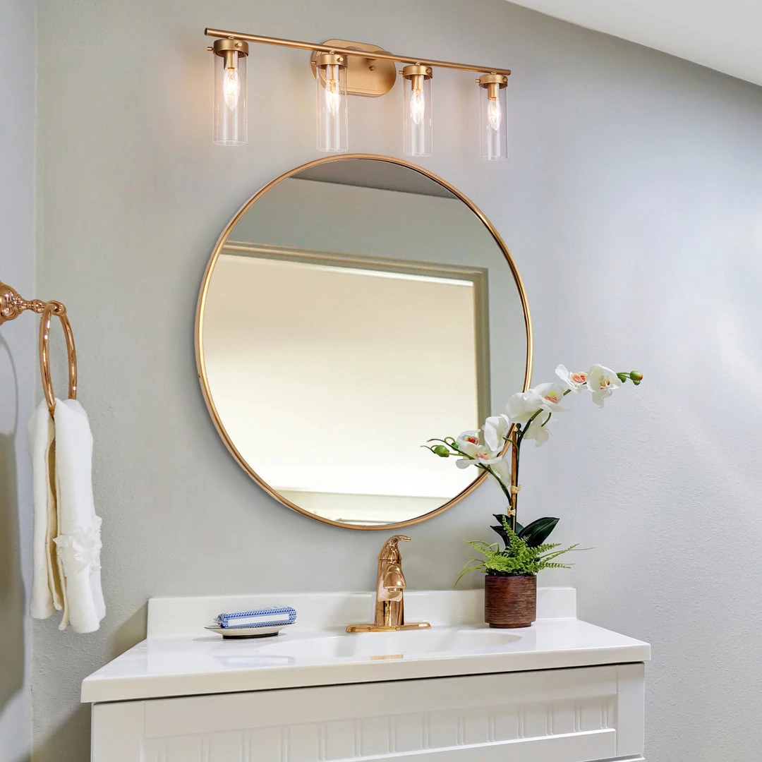 This simplistic modern vanity bathroom light merges the modern sleek physique and the retro-inspired color palette together. Manufactured out of high-quality mixed metals and glass, this fixture is a great combination of durability and aesthetics.