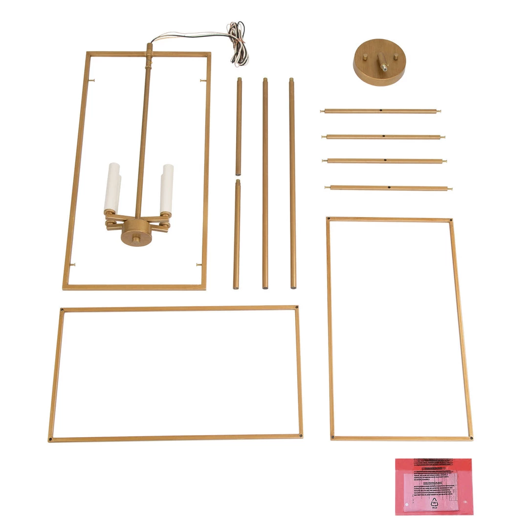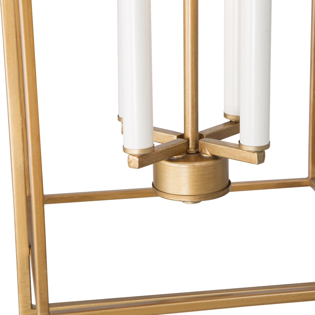 This collection has a unique overlapped rectangular exterior protecting a candelabra cluster, showcasing a modern charm by adding some gold and geometric elements.