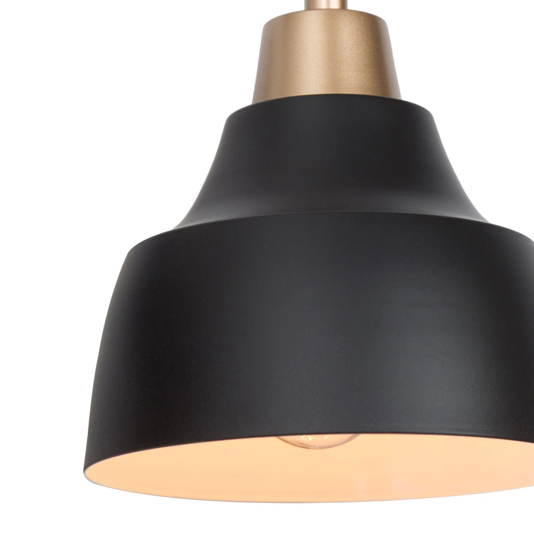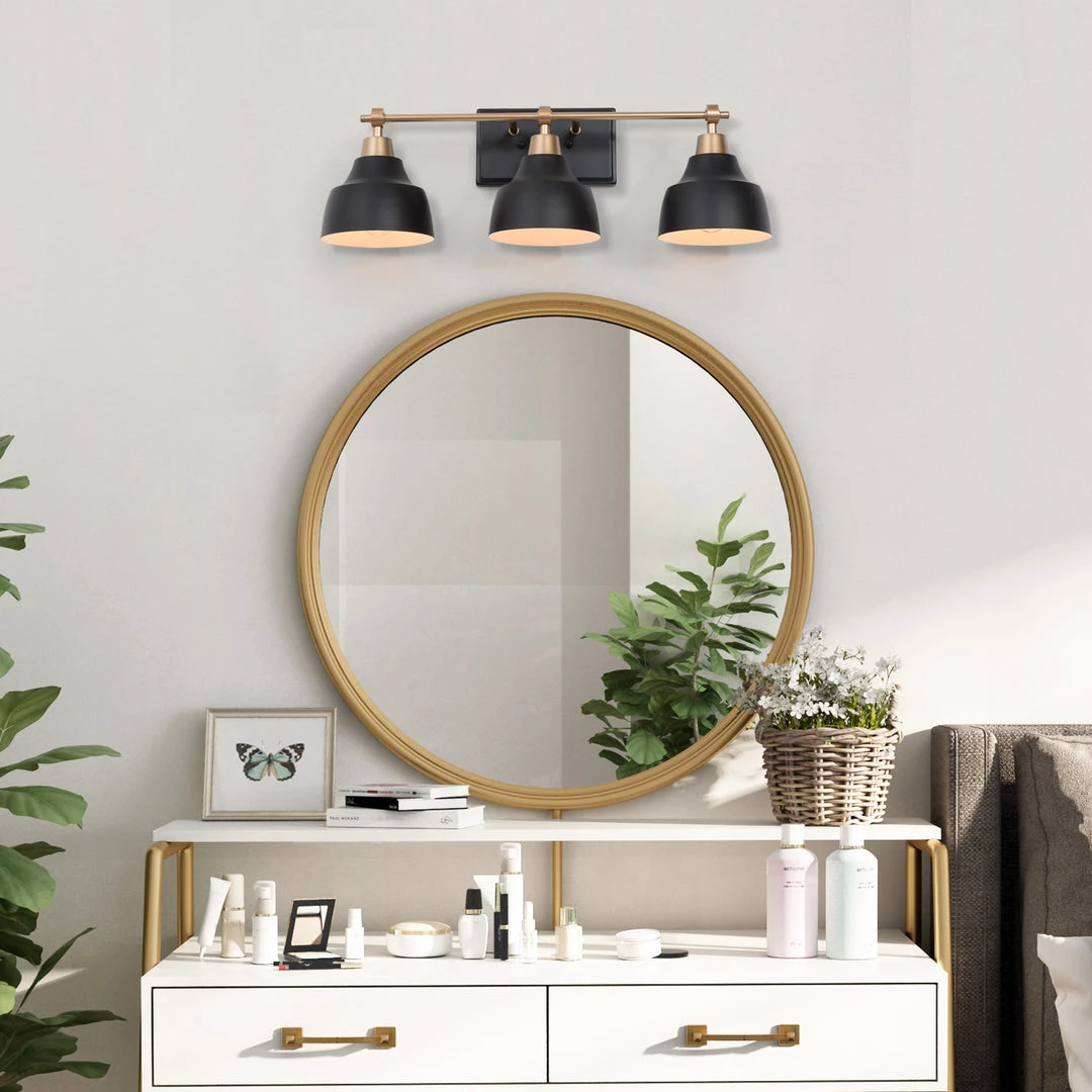 Modern and sure to be a classic, this vanity light has three sleek and minimalistic black shades extending from a center bar and three vintage gold caps. A contemporary design with clean lines and a modern silhouette, this fixture adds instant elegance and chicness beyond measure to a space.