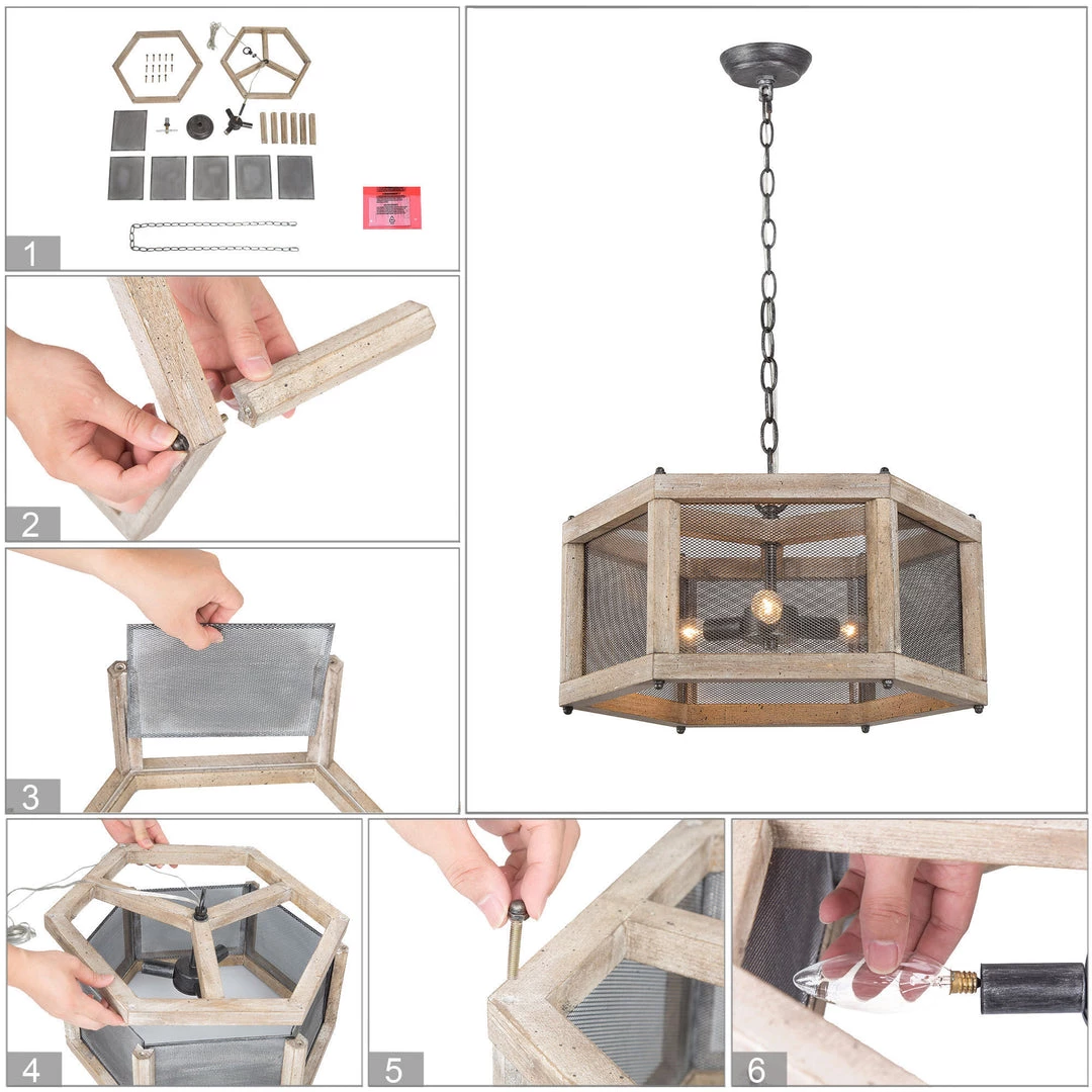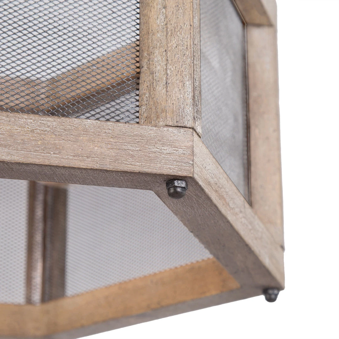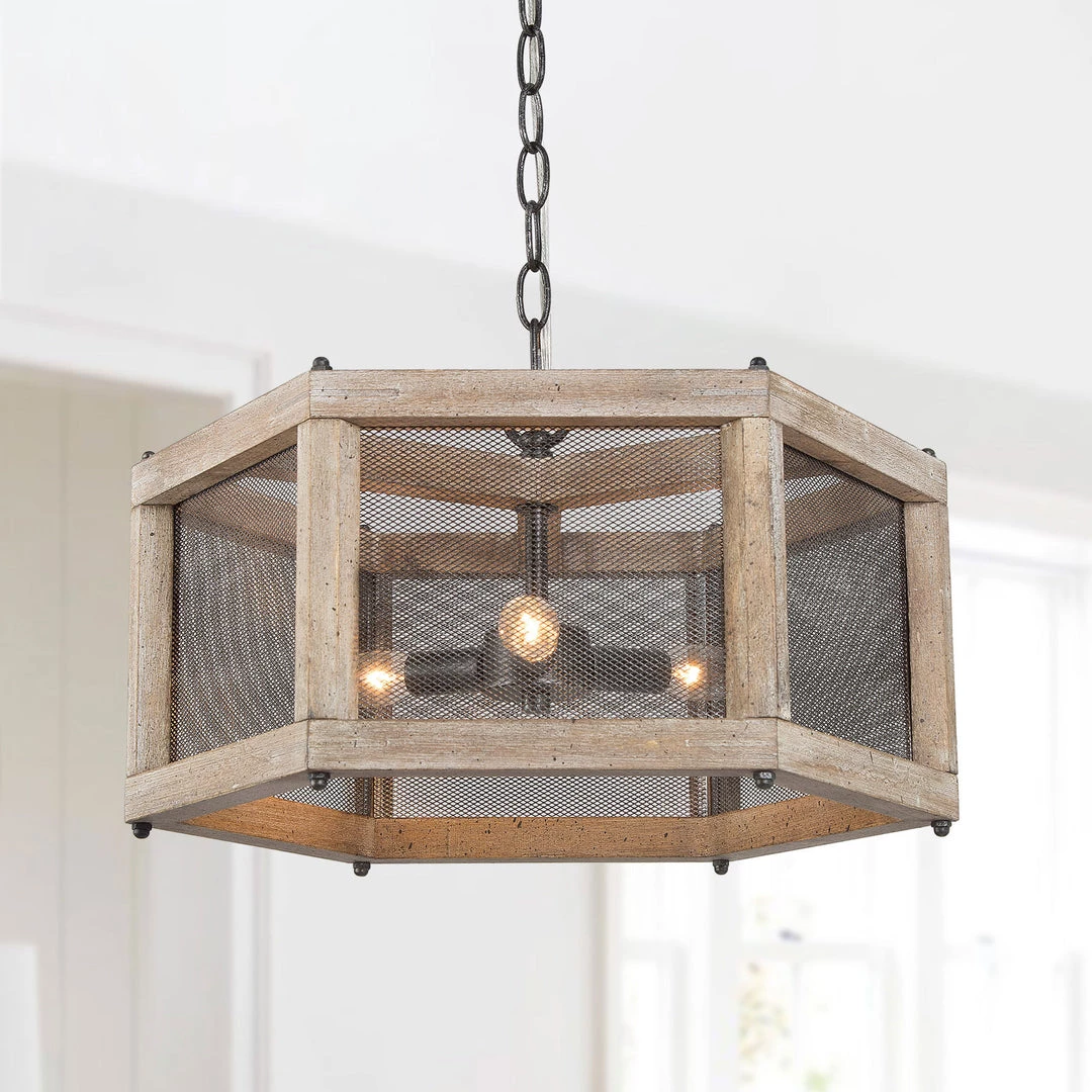 Cottage charm is displayed in the fine details of this rustic pendant. The combination of grey-washed wood frame and metallic fish net creates this vintage-inspired fixture that is strong in its cottage-style feel. Perfect for bedroom, over kitchen island area, and living room.