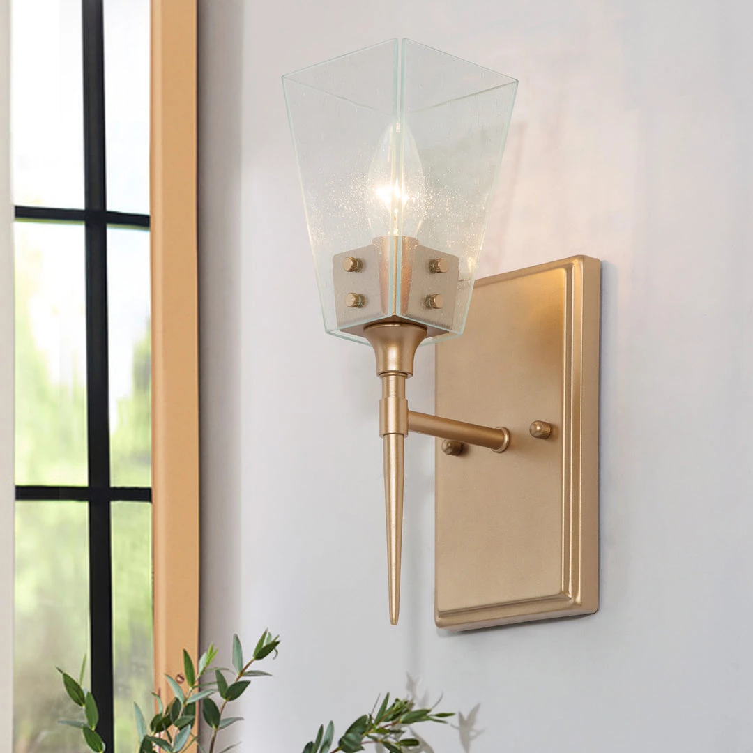 Bring the understated glam into your space with our incredibly on-trend torch-shaped vanity. The clean-shaped glass is suspended on the sharp gold metallic pillar that lends a feeling of modernity and sleekness. Perfect for bathroom, bedroom, foyer or kitchen.