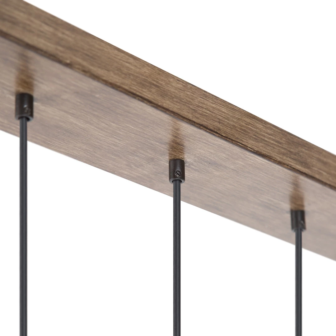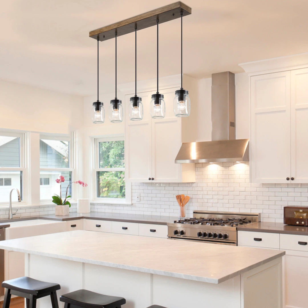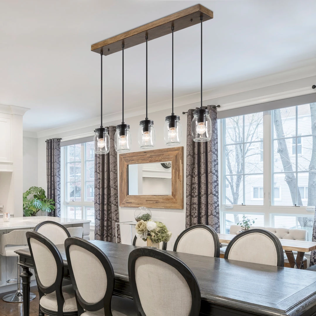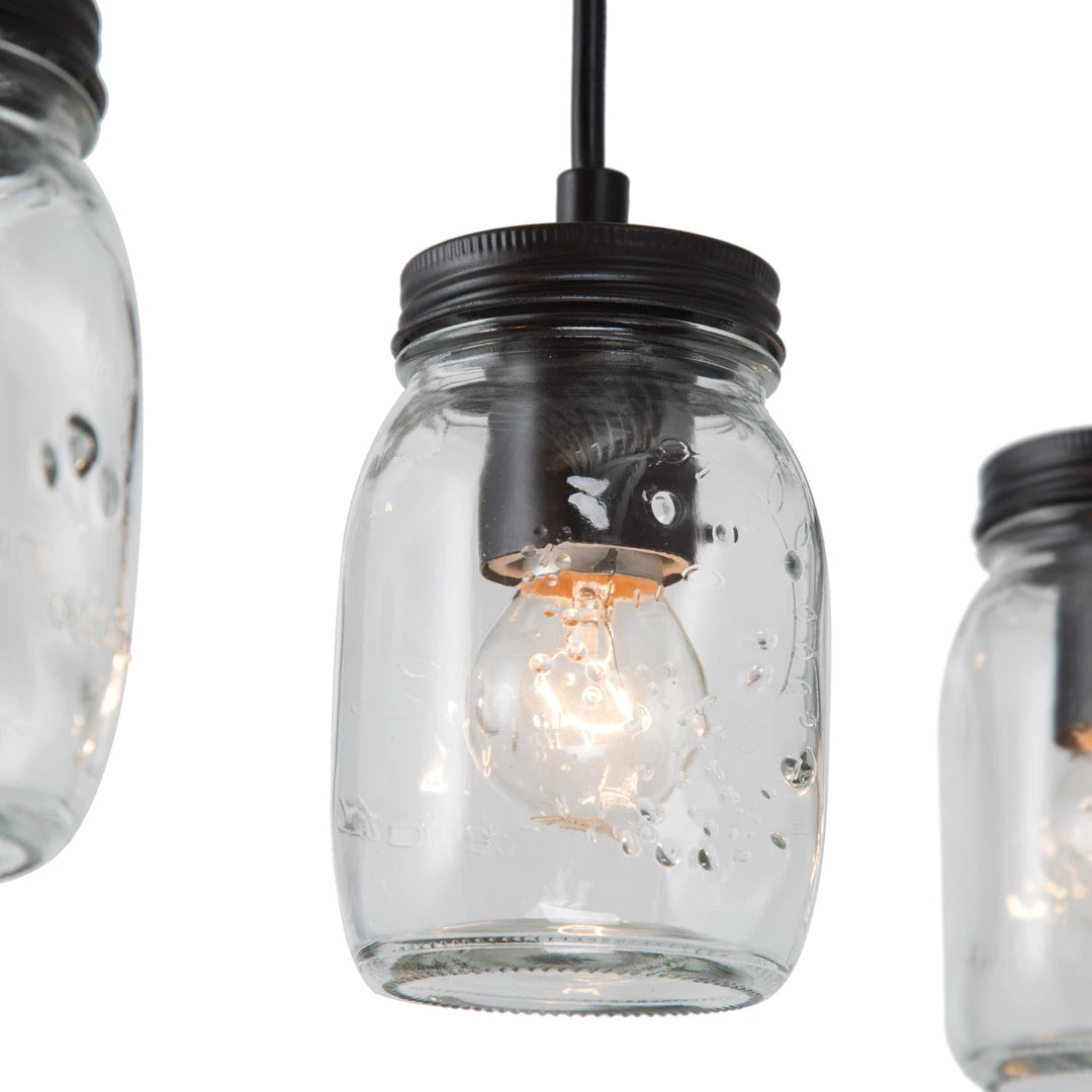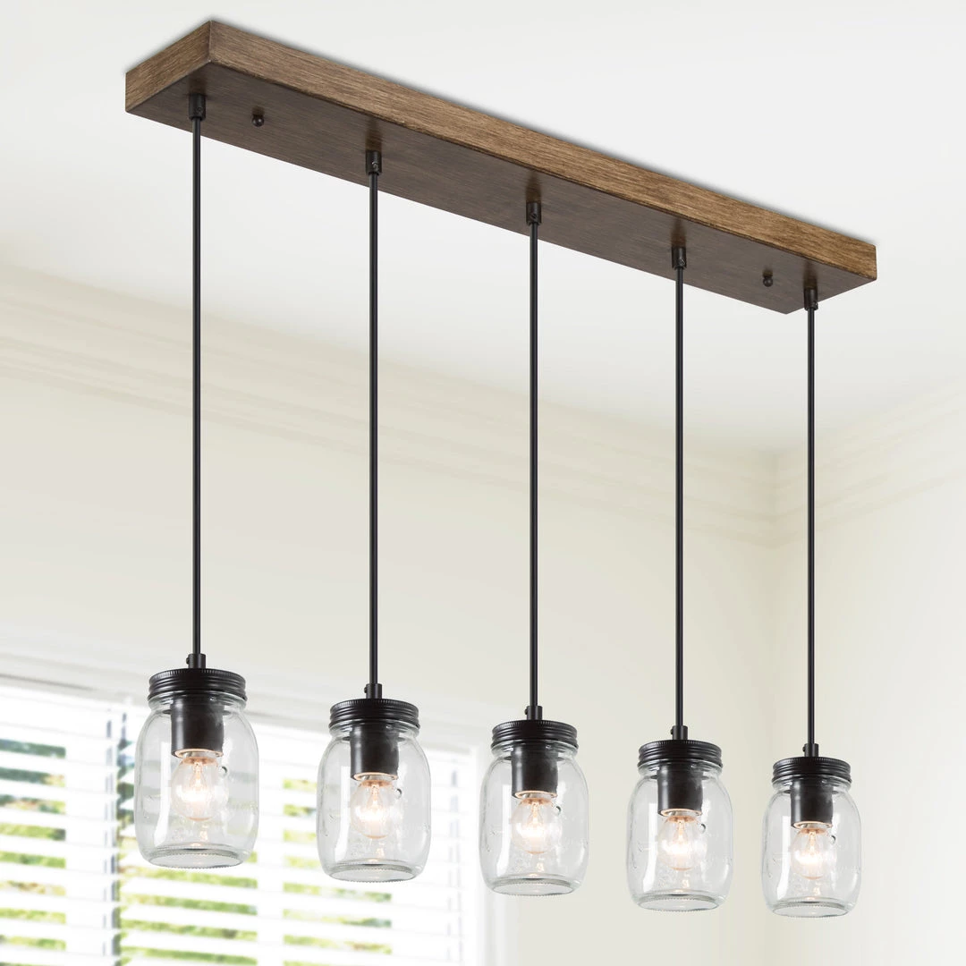 The simplistic Mason jar shades rest on a minimalist base finished in brown wood. With an asymmetrical silhouette, this clean and sleek chandelier is an attention grabber. Perfect for adding a modern rustic note to your modern or transitional home decor.